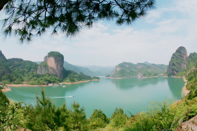 舟行湖面微风漾,山也朦胧,水也朦胧,山水氤氲俏壁雄。