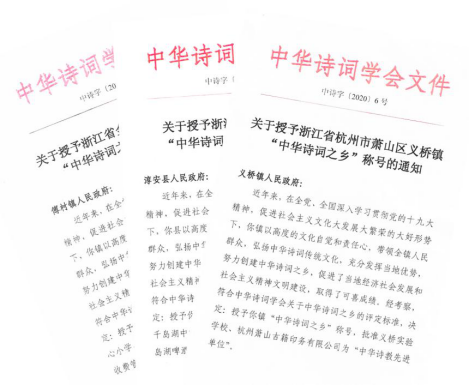 近日收到中华诗词学会批文,正式授予我省杭州市淳安县、杭州市萧山区义桥镇、金华市金东区傅村镇中华诗词之乡称号,同时授予杭州萧山区义桥镇实验学校、杭州萧山古籍印务有限公司,杭州淳安县千岛湖中等职业技术学校、姜家镇中心小学、杭州千岛湖啤酒有限公司,金华市金东区傅村镇中心小学、浙江省交通集团高速公路绍兴管理中心傅村收费管理所等7家单位为中华诗教先进单位。并批准在义桥镇设立中华诗词渔浦研究创作基地、在傅村镇设立中华诗词艾青研究创作基地。