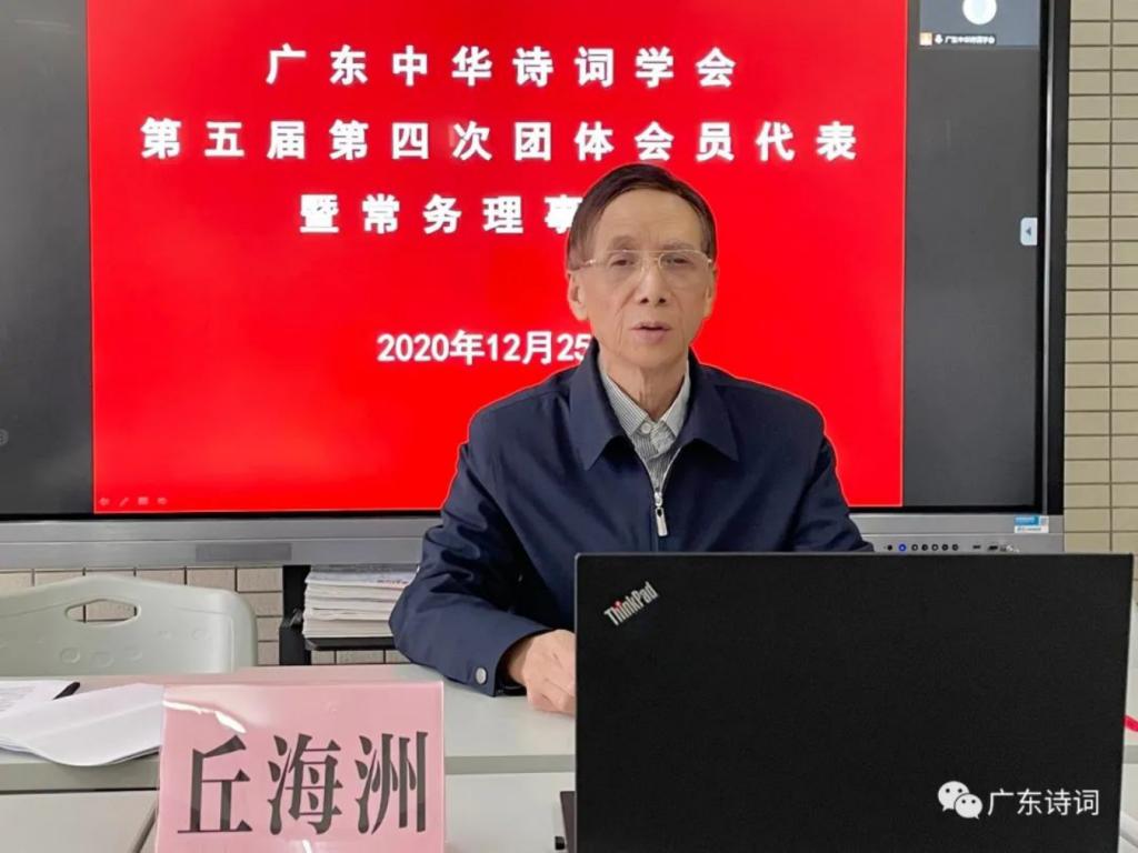 2020年12月25日上午,广东中华诗词学会用视频网络形式召开第五届第四次团体会员代表暨常务理事会议。丘海洲会长等学会领导和团体会员代表、常务理事一百余人出席了会议。会议由副会长罗益群主持,常务副会长赵维江代表学会作工作报告。