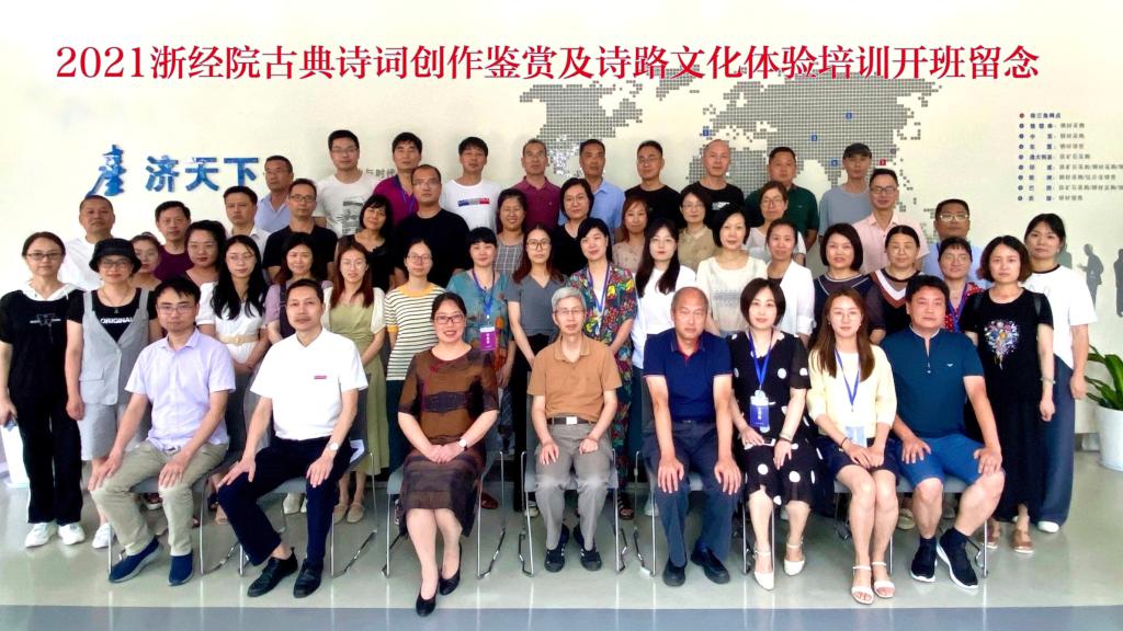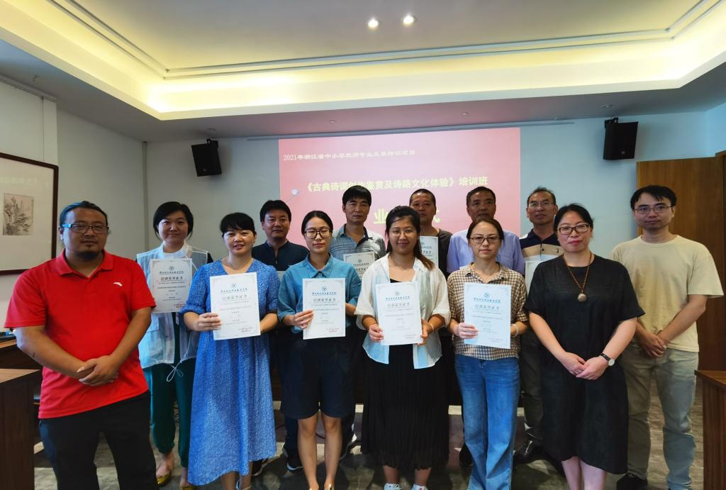 7月12日-23日,来自浙江省各地市37所学校的50位教师参加了《古典诗词创作鉴赏及诗路文化体验》培训班学习。此次培训班由中华诗词文化学院和浙江省诗词与楹联学会和联合举办,并作为2021年浙江省中小学教师专业发展培训项目。12天的专题培训,使学员们学员学习了诗词联的创作技巧和古诗文的吟诵方法,深入体验了中华古典诗词的魅力。培训项目还通过诗路采风等实践活动,激发起学员的创作热情,学员们纷纷吟诗填词撰联,创作出许多情韵俱佳的作品(部分学员作品附后)。