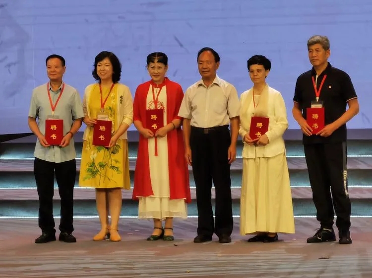 周文彰会长为诗教委员会主任郭羊成,副主任刘琴宜、郝红、张静和杨文才颁发聘书