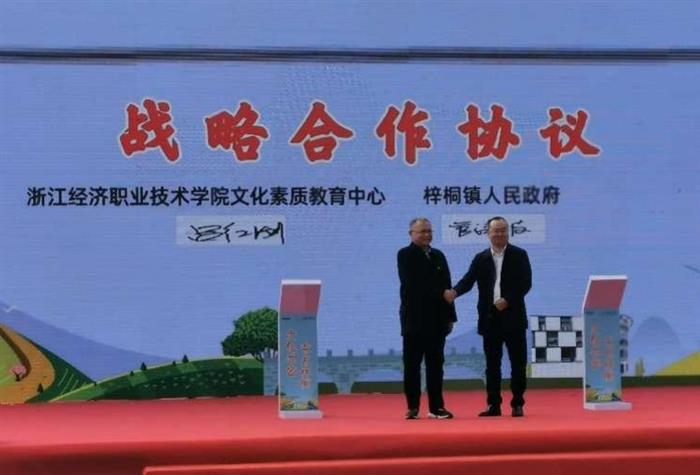 同时,学校充分发挥诗教特色产学研资源,以诗路经济赋能乡村振兴、区域共富建设。学校与淳安县梓桐镇、武义县俞源乡等人民政府建立战略合作关系,在诗路文化传播、乡村诗词美育、文化产业培育等方面展开深度合作,建设“诗画产业链”。助力梓桐镇开展美丽庭院建设,2021年黄村3A级景区顺利通过评审。开展送教下乡等活动,为当地企业文化、学校美育赋予鲜明特色和丰富内涵。学校有效推进乡村文化产业多元化发展,与千岛湖德隐陶局形成资源共享共同运营的合作模式,助力梓桐镇民匠营提升陶瓷订单数量,共产生产业经济效益120余万元。增加村集体收入20余万元,带动农村农民收入40余万元,临时聘用农民工2000余人次,解决就业岗位6人。2022年淳安县梓桐镇下辖梓溪村、黄村村公布为杭州市第一批“共富村”,共建帮扶产业公布为“杭州市第一批产业共富带项目”,在助力乡村振兴过程中展现出了新时代职教担当,校地共建相关活动获光明网、中国报道、中国新闻在线等多家媒体报导。