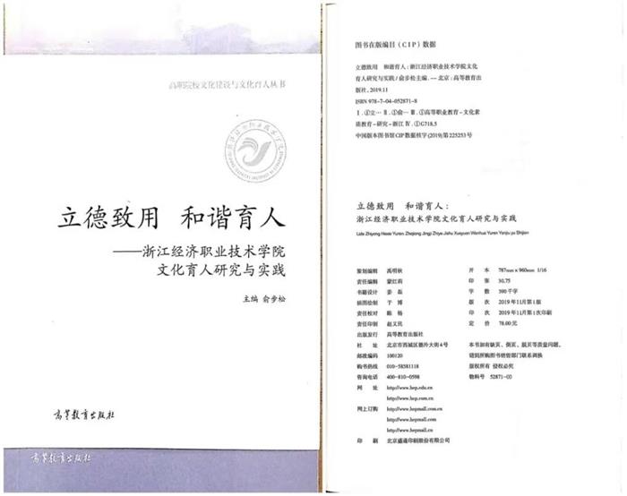 学校诗教成果取得重大突破。《诗教文化刍论》《诗教文化新论》《立德致用和谐育人——浙江经济职业技术学院文化育人研究与实践》受到全国诗教界及兄弟院校肯定;国家社科基金青年项目《<翰苑新书>整理与研究》立项,实现学校国家级项目零的突破;《核心价值观与精神家园——当代中国马克思主义的中华文化之根》被浙江省委宣传部评为“优秀通俗理论读物”;《人文素养与中华诗教》(浙江省教育厅“十二五”规划教材)《高职高专简明书法教程》(教育部“十三五”规划教材)《艺术欣赏》《原始瓷与印纹硬陶品鉴》等诗性文化教材公开出版,《职场礼仪与沟通》获首届全国优秀教材建设二等奖;公共艺术教育成果斐然,学生在全国各类刊物发表诗词作品1000余首,书、画、印、朗诵等作品在教育部经典诵讲写大赛、浙江省大学生艺术节等省部级赛事中荣获一二三等各级奖项100余项。