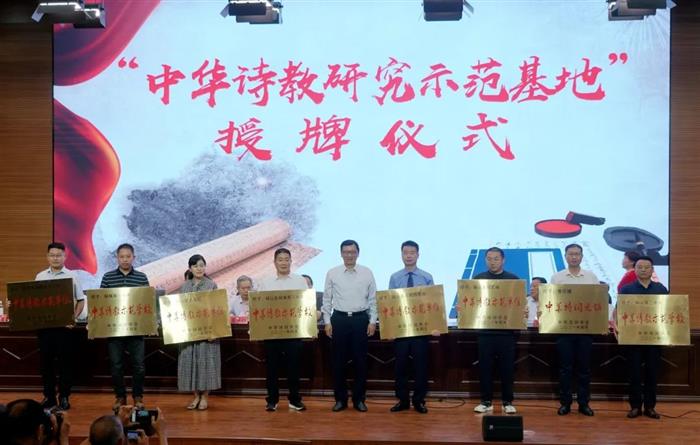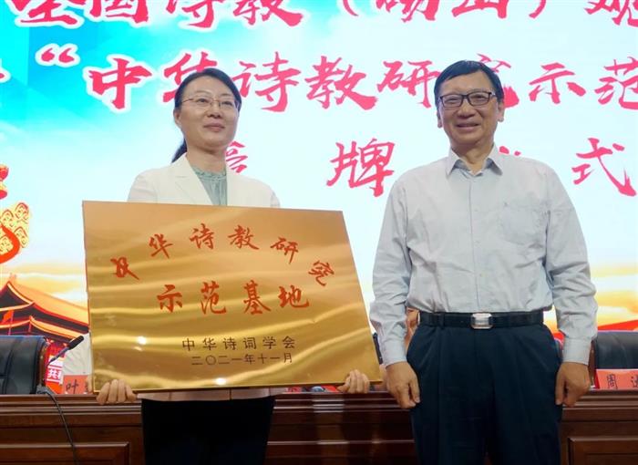 中华诗词学会副会长周达(右)授予砀山县政府“中华诗教研究示范基地”牌匾。