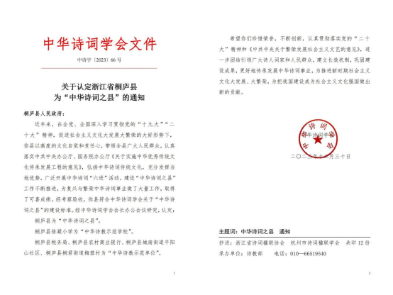 近日,中华诗词学会分别发文,授予浙江省常山县、桐庐县为中华诗词之县,授予常山县阁底小学、衢州数字工业学校为“中华诗教示范学校”,常山县新华书店、常山县渡口社区为“中华诗教示范单位;授予桐庐县徐凝小学为“中华诗教示范学校”、 桐庐县税务局、桐庐县农村商业银行、桐庐县城南街道平阳山社区、桐庐县桐君街道梅蓉村为“中华诗教示范单位”。至此,浙江省获批中华诗词之乡的区县已有13个。