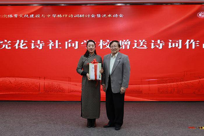 会上,田麦久先生向沈阳体育学院赠送浣花诗社代表作《中国奥冠风采诗词》四卷集,图书馆馆长庞宏娜代表学校接受赠送。