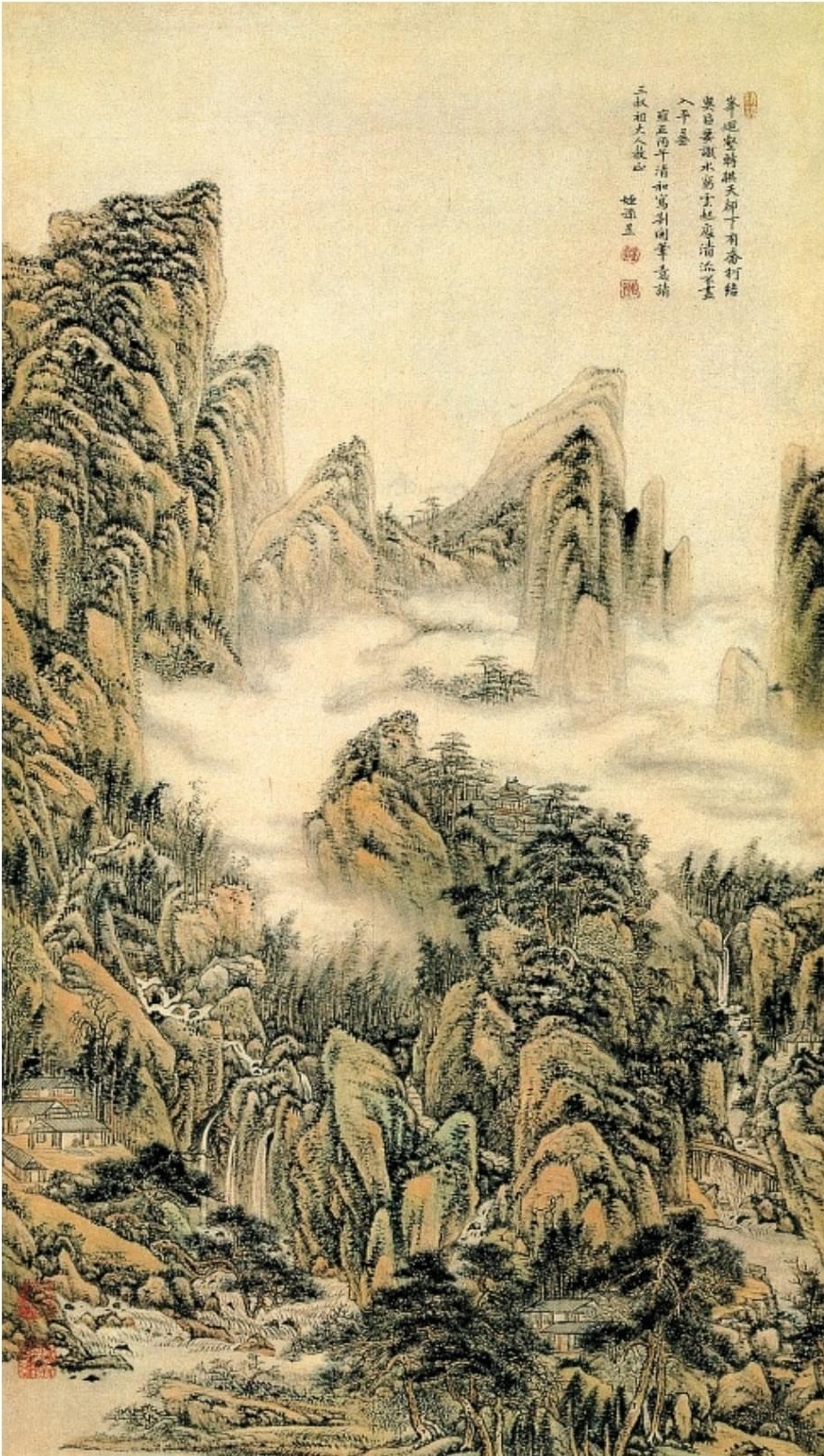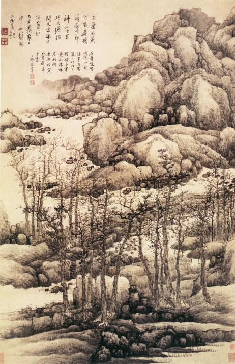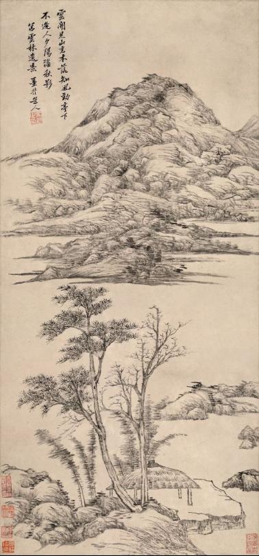 王昱《重林复嶂图》。这是一幅画家自题题画诗的作品。主景层峦耸峙,流瀑飞泻于山坳,溪泉曲折流淌;山路盘旋萦回,雾霭迷弥,忽隐忽现于峰峦之间;林壑幽深,松阴繁密。王昱题七绝题于画面:“峰回壑转拱天都,下有乔柯结奥区。要识水穷云起处,清流不尽入平芜。”题诗真实地描写画面景物,曲尽画幅之美,将画意、画境成功地转换成诗意、诗境,结句更是将赏画人的思路引向画外,给人以悠悠不尽的神韵。