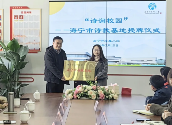 随后,市诗词学会会长邱东晓向志摩小学校长顾晓红授予“海宁市诗教基地”牌匾。沉甸甸的牌匾,不仅是对志摩以往诗歌教育工作穿越时空的致敬,更是对打造志摩小学诗意校园的殷切期望。