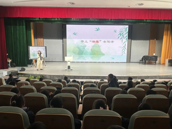 仪式结束后,市诗词学会副秘书长乔宁为志摩小学四年级全体学生进行了题为《带上“法宝”去写诗》的集中授课。课堂上,乔宁老师围绕“看见、感受、联想”三个关键词,为学生们提供了易懂、易用的写诗“法宝”,并通过相应的诗歌赏析和思路还原一一讲解如何运用这些“法宝”去写诗,鼓励学生们踊跃进行诗歌创作。