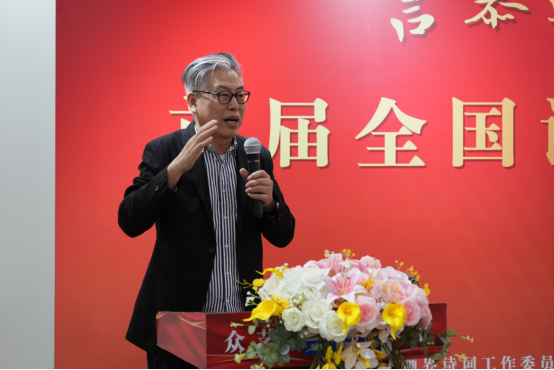周文彰会长作了热情洋溢的致辞。他从三个维度,谈了此次活动的意义。一是“言恭达助学行动”有助于推动诗书画融合。言恭达先生作为书法界与文化领域的大家,以深厚的学术造诣执教多所高校,推动诗书画融合。多年来,诗、书、画三者的分离非常普遍:诗人能写书法者很少,书家能写诗词的不多,画家作品上题画诗难得见到,题款字也力不从心。比如,庆祝建党的生日的书法展上,书写自作诗词者凤毛麟角,多为唐诗宋词的誊抄;新时代主题画展中,题画诗多引古人之句,鲜见原创佳作;诗词界能用书法呈现自创诗词者,更是屈指可数。言恭达先生发起“言恭达助学行动”,为诗书画融合尽自己的力量,这份担当令人钦佩。二是“言恭达助学行动”融美育实践与文化传承于一体。教育部推行的“美育浸润行动”,为文化传承注入全新活力。而“言恭达助学行动”首届全国诗书画作品展览,正是对这一行动的积极响应与生动实践。学校作为文化传承的前沿阵地与人才培养的摇篮,在美育教育中扮演着关键角色。将诗书画经典融入师生学习生活,恰似在心灵沃土播撒美的种子,唤醒他们对艺术的感知与追求。当学生参与诗书画融合创作时,不仅能构建多元审美心理结构,实现精神世界的全面发展,更能在传统文化的滋养中,树立正确价值观,厚植文化自信,为未来成长筑牢根基。三是“言恭达助学行动”集中于学校师生眼光深远。从个人发展层面看,诗书画融合对提升综合国学与艺术修养意义深远。诗,以凝练文字道尽人间百态;书,承载千年文脉,彰显汉字神韵;画,用笔墨勾勒天地风华。三者交融,相得益彰。于诗意中涵养品德,在书法里感悟文化深邃,于绘画中营造意境之美。这种融合不仅丰富艺术表达,更能在潜移默化中培育既有深厚文化底蕴,又具卓越艺术才华的新时代人才。