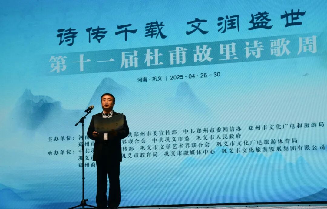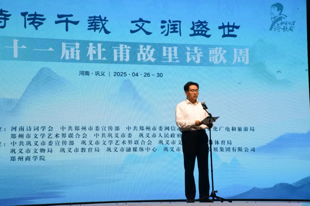 巩义市委副书记、市长郭程明致辞。他说,巩义作为杜甫的故乡,既是他忧国忧民精神的发源地,也是其诗歌文化遗产的传承地。举办第十一届杜甫故里诗歌周系列活动,既是对传统文化的深情回望,更是对时代使命的庄严承诺。巩义将以此为契机,通过诵杜诗、展风采、探文脉、聚名家等形式,把诗歌周打造成为文旅交融的瑰丽画卷、文化惠民的温暖港湾。同时,也诚邀各位嘉宾漫步巩义的青山碧水,在杜甫诗歌中体味“露从今夜白,月是故乡明”的乡愁,在河洛大地感受“星垂平野阔,月涌大江流”的盛世气象。